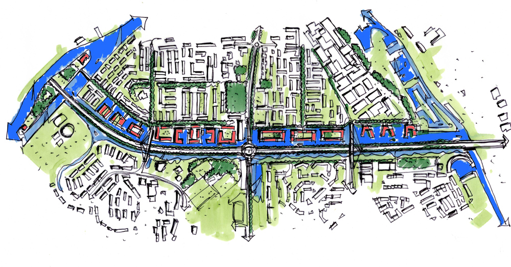 | In het midden van links naar rechts (horizontaal) de Stadsrondweg met daarboven de nieuwe vaarverbinding tussen Geeuw en Woudvaart. |